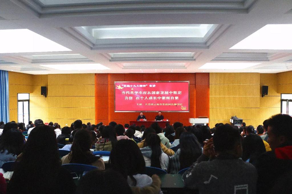 12月11日,共青团云南省委副书记赵国良应邀到保山中医药高等专科学校宣讲党的十九大精神。讲座由学校党委书记胡飚主持,共青团保山市委、学校团委负责人和青年学生、学校团学干部共300余人聆听了讲座。