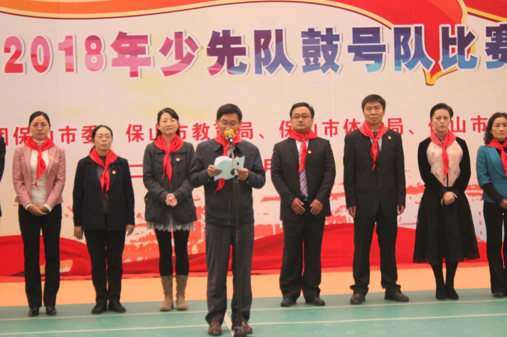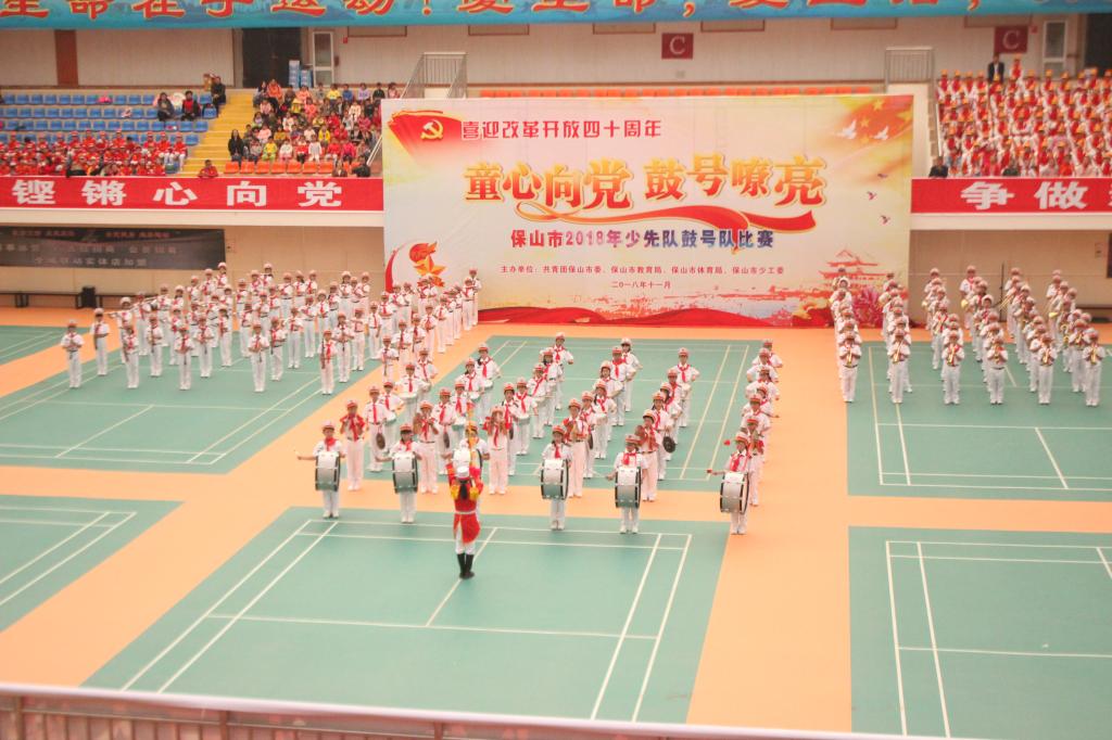 11月9日,由共青团保山市委、市教育局、市体育局、市少工委主办的以“童心向党,鼓号嘹亮”为主题的保山市2018年少先队鼓号队比赛在奥新体育馆举行。市人民政府副市长宋光兴、团省委副书记魏妮娅、省少先队总辅导员栾丽华等相关领导出席活动。来自全市五县(市、区)共12支代表队参与角逐,1200余名少先队员参加现场比赛。