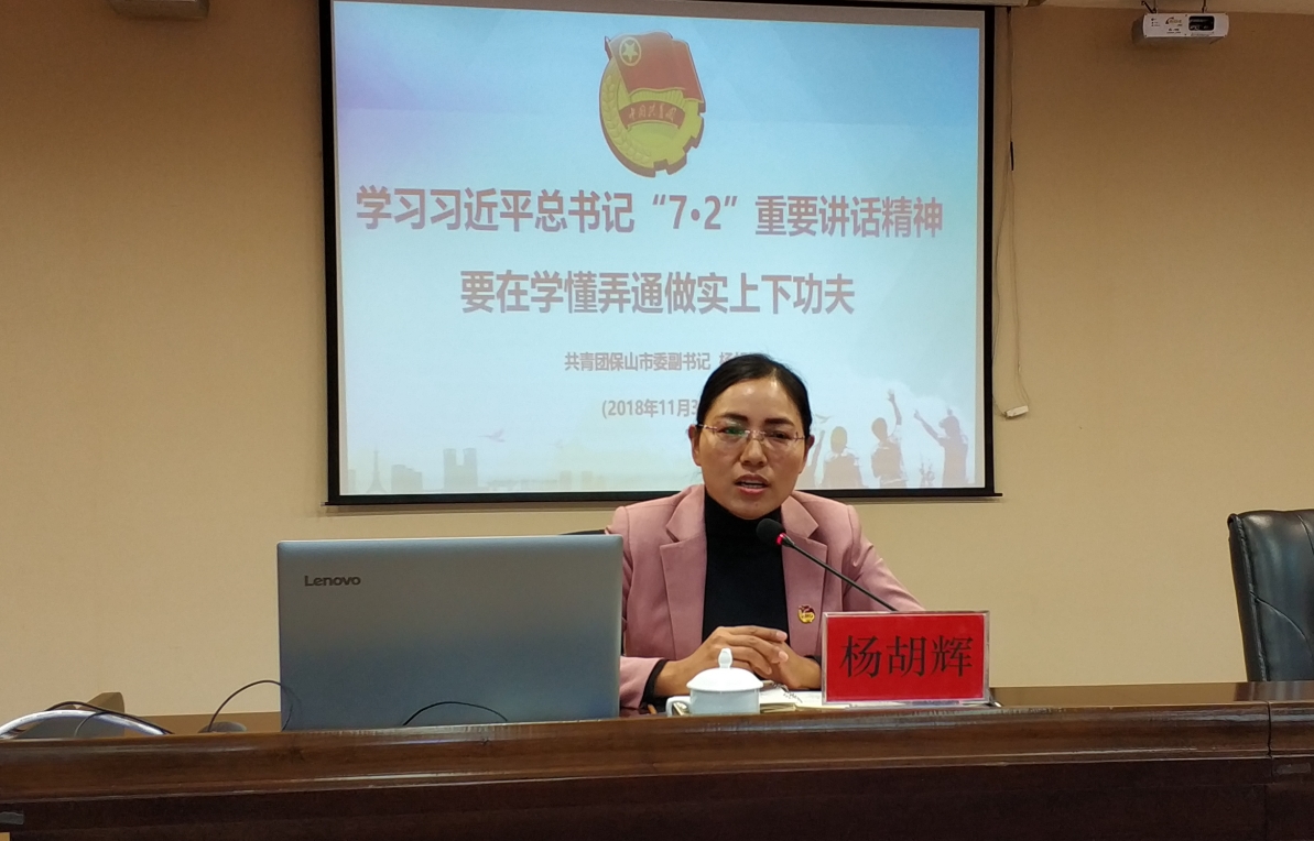 11月30日,龙陵县举办学习习近平总书记“7·2”重要讲话精神专题培训班,共青团保山市委副书记杨胡辉出席并作动员讲话和专题宣讲。共青团龙陵县第十六届委员会委员、候补委员、各乡镇完职中、企业团委书记、西部计划志愿者以及各相关单位团组织负责人共计100余人参加培训。