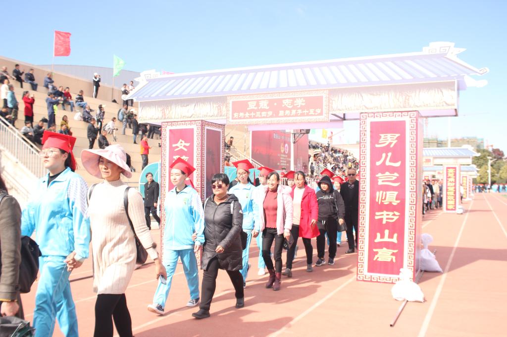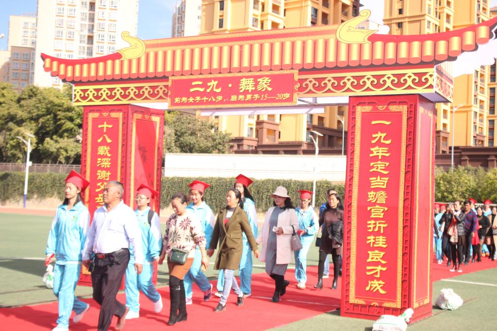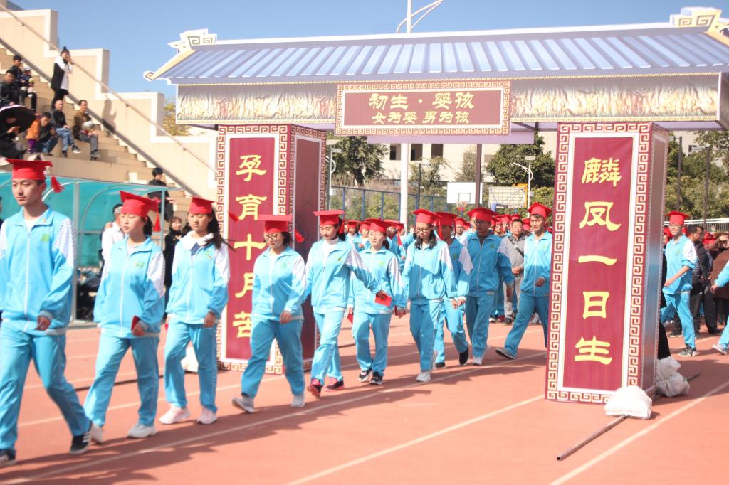 成人仪式上,同学们面向国旗奏唱国歌,戴成人帽,迈过“初生·婴孩”、“旬岁·孩提”、“龆髫·幼学”、“豆蔻·志学”、“二九·舞象”五道代表学生成长的门,并庄严的进行宪法和成人宣誓。