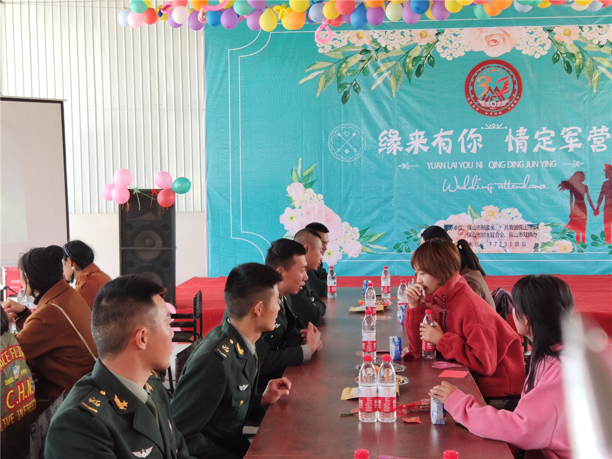 12月20日,为拓宽保山单身青年职工沟通交流渠道,搭建平等、友好、真诚的交流平台,由保山市总工会、共青团保山市委、保山市妇联、保山市双拥办联合在某驻保部队营区举办了以“缘来有你 情定军营”为主题的“2019年保山青年职工军地联谊活动”,保山市退役军人事务局精心组织,活动反响热烈。一起来感受下这不一样的浪漫氛围吧!