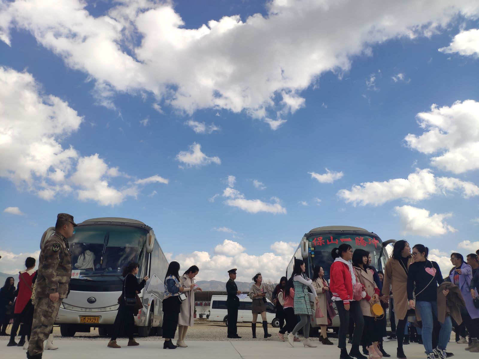 为了给活动增色,今天保山的天气也格外给力。女嘉宾刚下大巴,清爽的天空、“制服诱惑”就迎面袭来,一时间纷纷少女心爆棚。