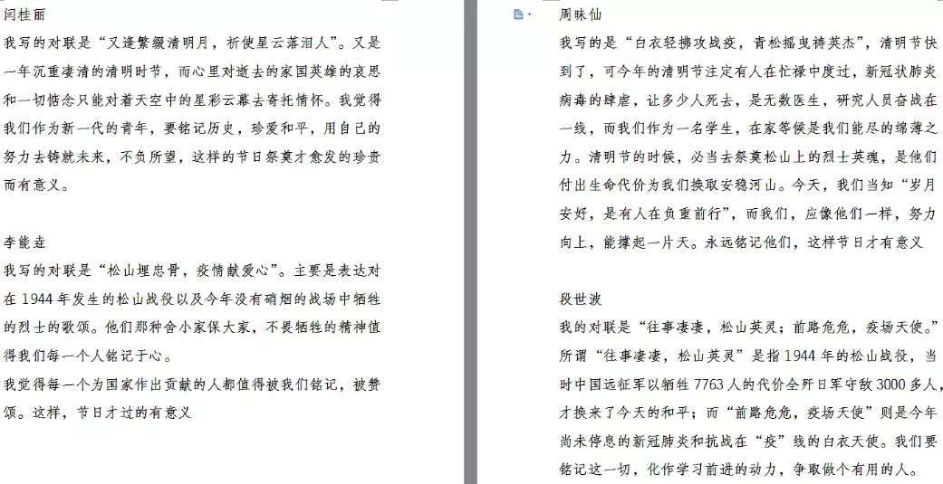 还有一部分学生不仅抒写了缅怀英烈之情,还与当前的新冠肺炎疫情结合起来。“我的对联是‘往事凄凄,松山英灵;前路危危,疫场天使。’所谓‘往事凄凄,松山英灵’是指1944年的松山战役,当时中国远征军以牺牲7773人的代价全歼日军守敌1200多人,才换来了今天的和平;而‘前路危危,疫场天使’则是今年尚未停息的新冠肺炎和抗战在‘疫”线的白衣天使。我们要铭记这一切,化作学习前进的动力,争取做个有用的人。”学生段世波在微信群里说到。