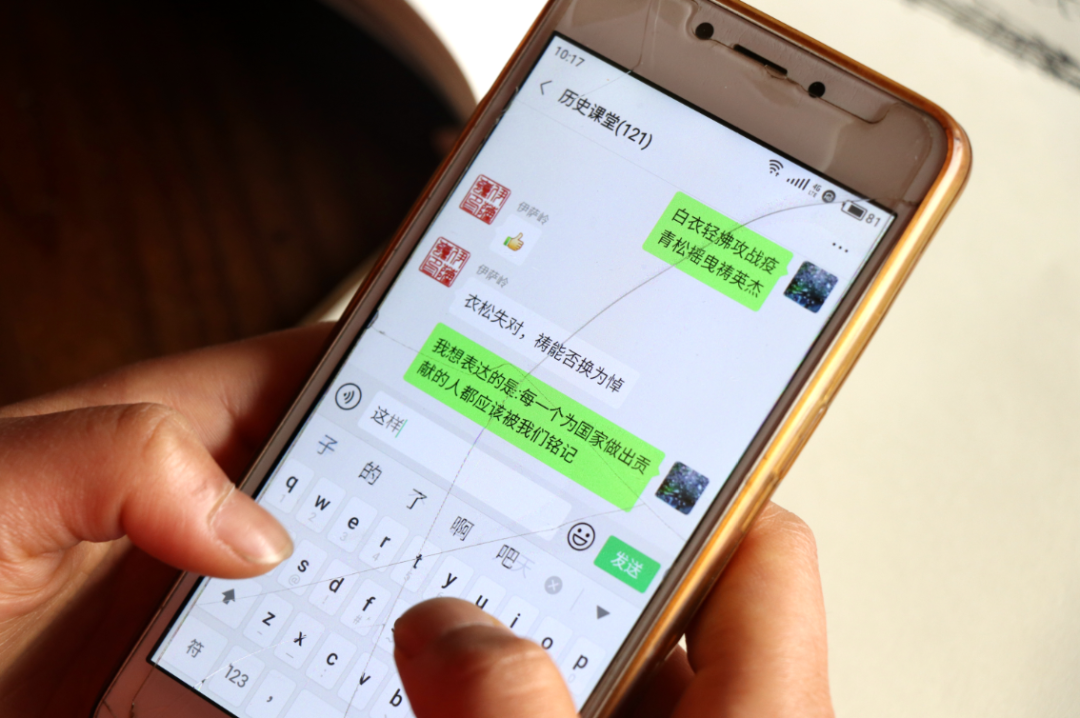 “同学们,为严格防控新冠肺炎疫情,避免人群聚集,防止交叉感染,不主张聚集性祭扫纪念活动。我们可以通过‘历史课堂’微信群开展文明祭奠,抒写感言寄语,表达崇敬之心、感念之情、传承之志。”房家维老师在群里发出倡议的同时,自己也率先写了几幅楹联:“血洗松山,岁岁愁云催泪雨;烟消怒水,声声杜宇断肝肠。”“泪何止洗山川,烈士英灵不朽,青松举目瞻雕像;尘岂能封岁月,英雄豪气常存,野草弯腰祭国魂。”学生们纷纷效仿,兴趣高涨,“鲜花朵朵悲先烈,松海苍苍唁鬼雄”“清明雨水抚山影,古木松涛祭龙魂”等70多幅楹联也陆续发在了微信群上。