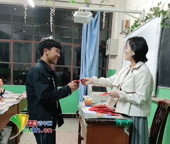 图为西南大学研支团成员司金冉为学生发放“红包”。西南大学研支团 供图