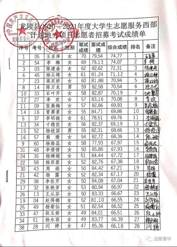 附件:《龙陵县2020-2021年度大学生志愿服务西部计划地方项目志愿者招募考试成绩单》