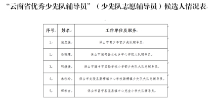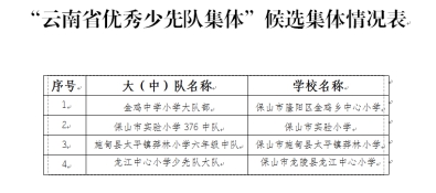 现将保山市拟上报的全省优秀少先队员、优秀少先队集体、优秀少先队辅导员、优秀少先队工作者和优秀少先队工作(活动)案例候选情况公示如下,若有异议,请在2020年11月6日前向团市委实名反映。