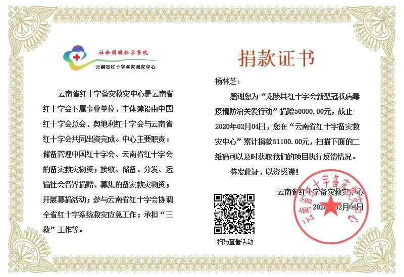 2月4日,保山市青联委员、保山中远建筑工程有限公司董事长、龙陵中基新型建材有限公司董事长段映国携夫人杨林芝向龙陵县红十字会捐赠资金5万元,用于疫情防治工作,用实际行动表现出新时代青年企业家的社会责任和奉献精神,诠释着当代保山青年的责任与担当。