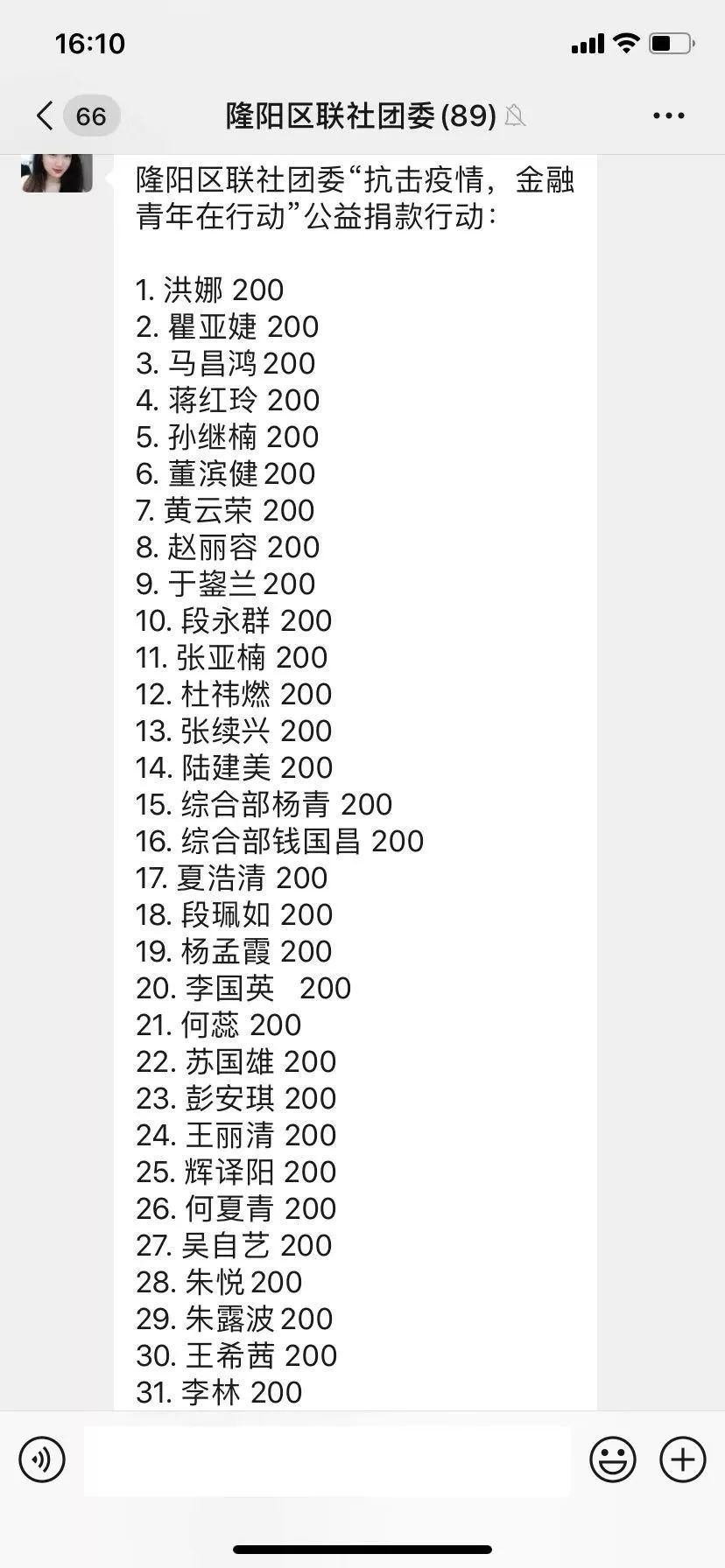 为凝聚青春正能量,众志成城,共克时艰,隆阳区农村信用合作联社团委积极响应金融团工委、全国金融青联和金融志愿者协会依托中国青少年发展基金会于2020年1月29日共同发起的“抗击疫情金融青年在行动”公益捐赠特别活动,为抗击疫情奉献自己的力量。活动发起后,保山市青联委员、隆阳区农村信用合作联社团委书记洪娜组织联社广大青年职工积极参与,踊跃捐款,短短两天时间内收到60笔捐赠,累计捐赠资金达1.2万元,目前募集资金已拨付到湖北。