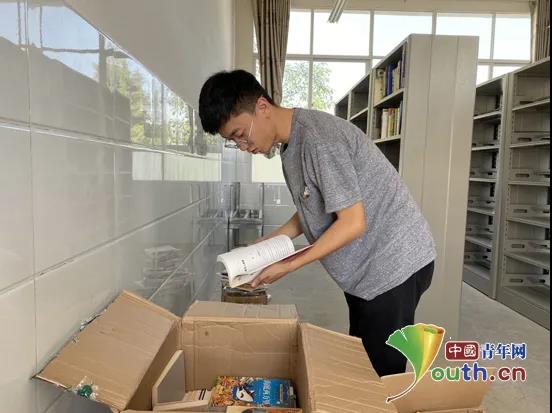 图为江南大学研究生支教团成员王谡阳整理募捐的爱心图书。江南大学研支团 供图