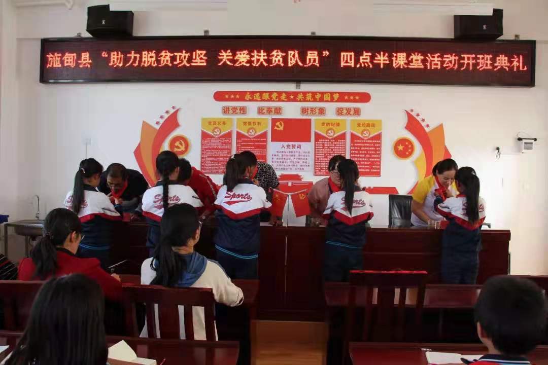 首先由团县委副书记作开班讲话,她指出了活动的背景、内容和意义,并希望孩子们树立远大的人生理想,敢于有梦、勇于追梦、勤于圆梦,希望孩子们把握美好的童年时光,集中精力好好学习科学文化知识,努力争做一名新时代中国特色社会主义接班人;紧接着,甸阳镇中心学校校长对主办单位表示了感谢,强调学校将会尽最大的努力弥补孩子缺失的陪伴,通过营造一个安全温馨的学习环境,帮助同学们提升自我认知、人际交往、自信心培养、自我好保护、习惯养成等方面的意识和能力,让父母在外安心工作,为打赢精准脱贫攻坚战贡献一份力量;随后,扶贫家长代表表示“四点半课堂”是一个很好的亲子沟通平台,不仅能让孩子们享受兴趣之乐,还能为扶贫干部解决了后顾之忧,能够一门心思的扎根基层,上山下乡,帮助那些更需要关爱和扶持的家庭,将自己家庭的温暖和爱送到他们家中,一户户传递下去;最后,学生代表在发言中表达了他们虽然有一个特别的称号——“留守儿童”,但是他们勇敢、快乐、自信,他们坚信,只要树立远大志向,就能做一名自尊、自立、自强的新时代好少年,将来为中华民族伟大复兴的中国梦而做出积极的贡献。