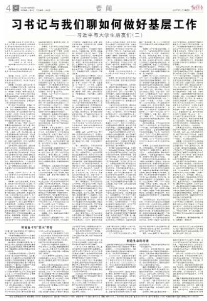 聊得最多的,还是围绕如何做好基层工作这一话题。习书记以自己的亲身体会,给我们讲述了做好基层工作的重要意义和如何搞好基层工作的心得体会,鼓励大学生深入基层,到生产第一线锻炼、提高自我。