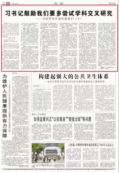 习书记在浙江主政的时候,对教育改革非常重视和关心。他说过,“不仅要开发学生智力,而且要培养学生的创新和实践能力”;“不仅要‘授之以鱼’,教授学生‘学会’,而且要‘授之以渔’,教授学生‘会学’”;青年学生要从“会读书的人”变成“会创造的人”;“既要读有字之书,也要读无字之书”。“坚持以创新带动教育教学改革,切实把创新实践活动贯穿于教育教学全过程,走一条创新型教育之路”。我们开展交叉学科研究,聚集这么多专业的学生一起思考、一起碰撞,就是要创新、要实践,这样学生们从事交叉学科研究工作,不仅能获得有意义的研究成果,还可以掌握研究的方法与技能、思考的逻辑与辨伪,加快成长为创新型人才。