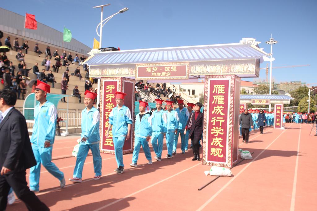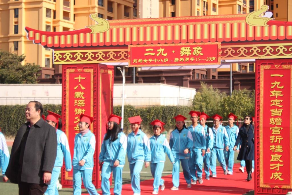 成人仪式上,同学们面向国旗奏唱国歌,戴成人帽,迈过“初生·婴孩”、“旬岁·孩提”、“龆髫·幼学”、“豆蔻·志学”、“二九·舞象”五道代表学生成长的门,并庄严的进行宪法和成人宣誓。