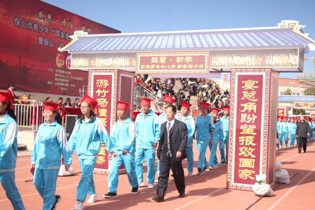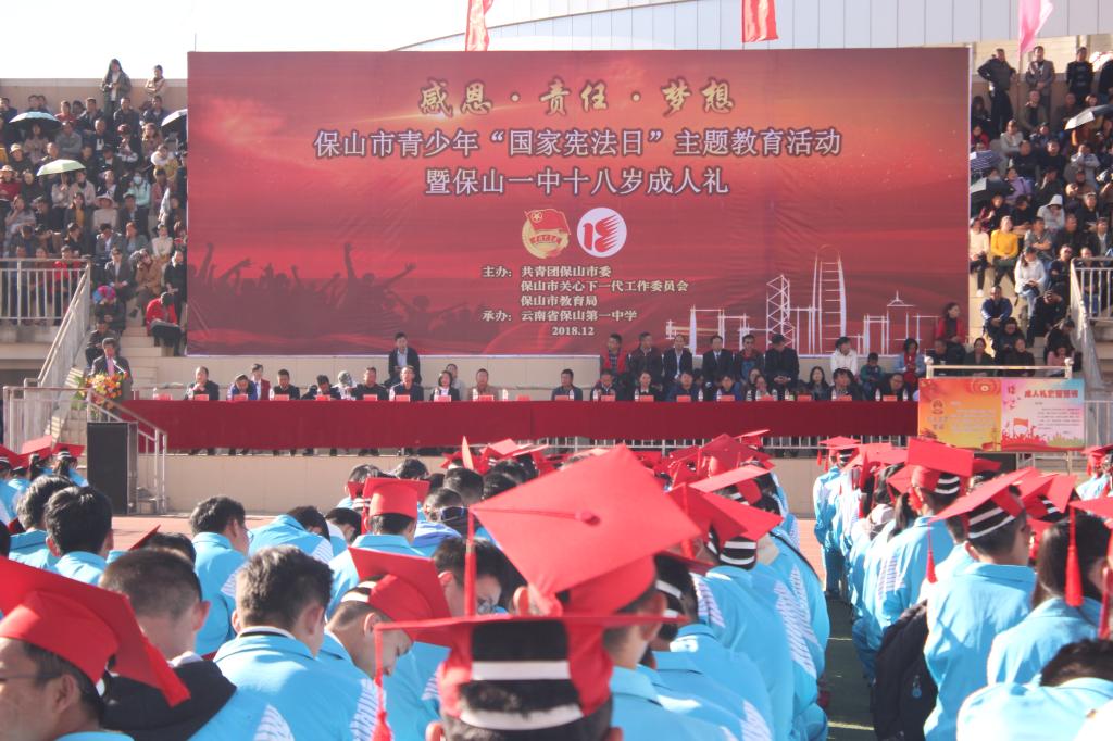12月4日,由共青团保山市委、市关工委、市教育局主办的2018年“国家宪法日”主题活动暨保一中十八岁成人礼在保山市一中隆重举行。活动以“感恩、责任、梦想”为主题,1100余名高三学子在全市预青专项组成员单位负责人、学校领导、老师和学生家长的见证和祝福下开启了他们人生的新起点。