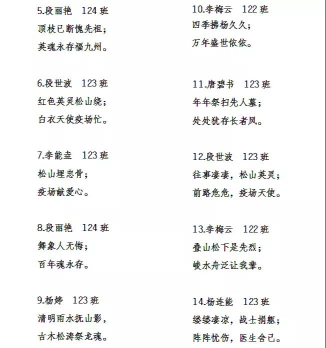 还有一部分学生不仅抒写了缅怀英烈之情,还与当前的新冠肺炎疫情结合起来。“我的对联是‘往事凄凄,松山英灵;前路危危,疫场天使。’所谓‘往事凄凄,松山英灵’是指1944年的松山战役,当时中国远征军以牺牲7773人的代价全歼日军守敌1200多人,才换来了今天的和平;而‘前路危危,疫场天使’则是今年尚未停息的新冠肺炎和抗战在‘疫”线的白衣天使。我们要铭记这一切,化作学习前进的动力,争取做个有用的人。”学生段世波在微信群里说到。