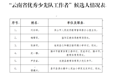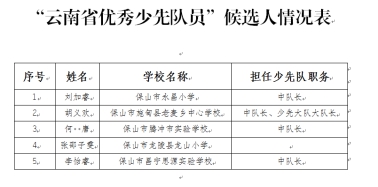 现将保山市拟上报的全省优秀少先队员、优秀少先队集体、优秀少先队辅导员、优秀少先队工作者和优秀少先队工作(活动)案例候选情况公示如下,若有异议,请在2020年11月6日前向团市委实名反映。
