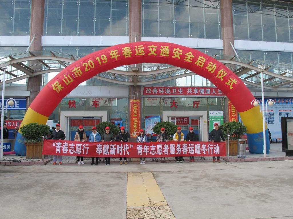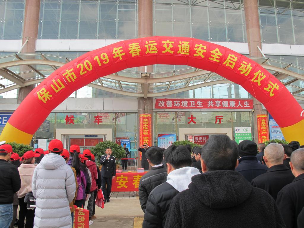 1月21日,共青团保山市委联合保山市公安局交通警察支队开展的保山市2019年春运交通安全启动仪式暨春运暖冬行动在保山市客运总站举行,相关单位工作人员及青年志愿者共200余人参加活动。