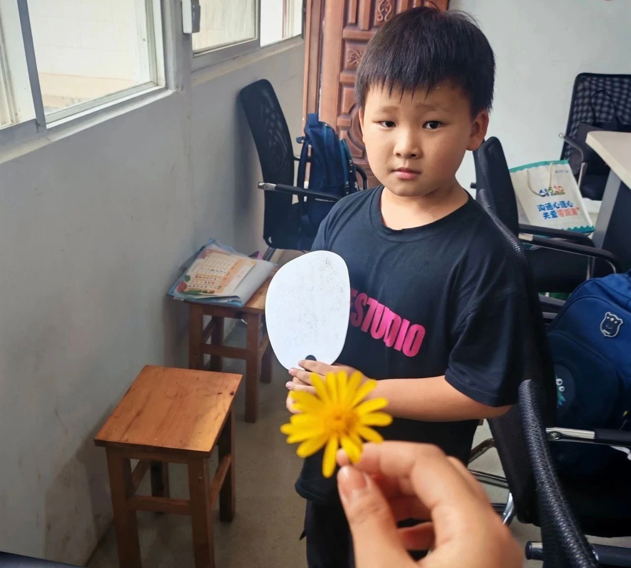 “巡视”的过程,孩子们腼腆地和我说话。当我走到小陶身边时,他抬起头看了我一眼,又低了下去继续折纸,这样的举动让我有点不知所措。接着,我问了他好几个问题,他都没有回答我,只是沉默,我看着他手上的动作并没有停,只是折了又拆开,拆开了又折......我从他手中轻轻地拿过纸,用尺子裁剪好,“这会儿就能折好了”,他点点头。我本以为小陶不会再和我说话,可是第二天他却送我一朵黄金菊。也许是从他第一次叫我“杨老师”开始,也许是从他第一次问我“疑”字怎么写开始,也许是从他第一次邀请我玩弹珠游戏开始,也许......黄金菊便开在了他的心间。