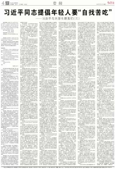 习近平同志出身高干家庭,但做人非常低调,心里总想着为百姓做事。在交谈中,他时常说,咱们为老百姓干事,不能有只追求自己生活快乐的思想。大学生也一定要丢掉这种思想,扑下身子为老百姓工作。他曾经多次跟我说:“我自己把‘自找苦吃、为老百姓做事’作为第一信念。尽管会有很多坎坷,每天都经历不同的挑战,除非身体不行了,除非不让我干了,只要没有这两种情况,我都会坚定不移走下去。”